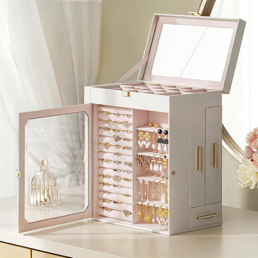 HOOBRO Jewelry Box with Mirror, Travel Jewelry Organizer with Glass Window, Vertical Storage, Christmas Gift, Gift for Loved Ones, for Earrings, Rings, Necklaces, Bracelets, White WT03JB04G2