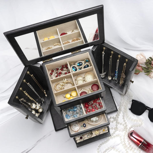 Emfogo Jewelry Box for Women, Rustic Wooden Jewelry Boxes & Organizers with Mirror, 4 Layer Jewelry Organizer Box Display for Rings Earrings Necklaces Bracelets (Black)
