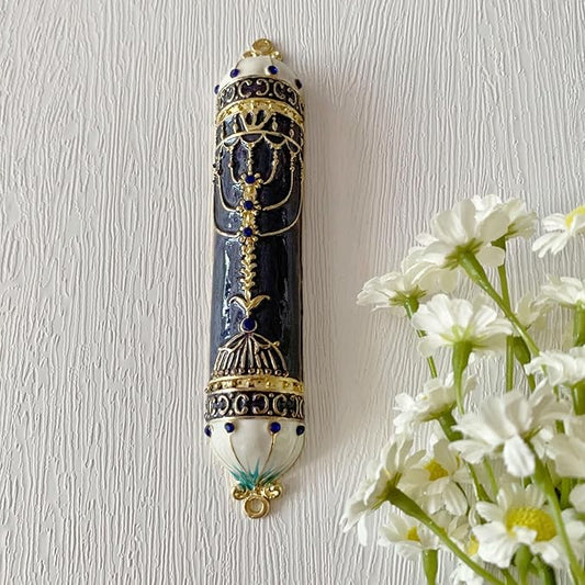 Mezuzah, Exquisite Black and Gold Enamel Mezuzah with Blue Crystal Accent