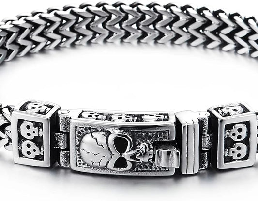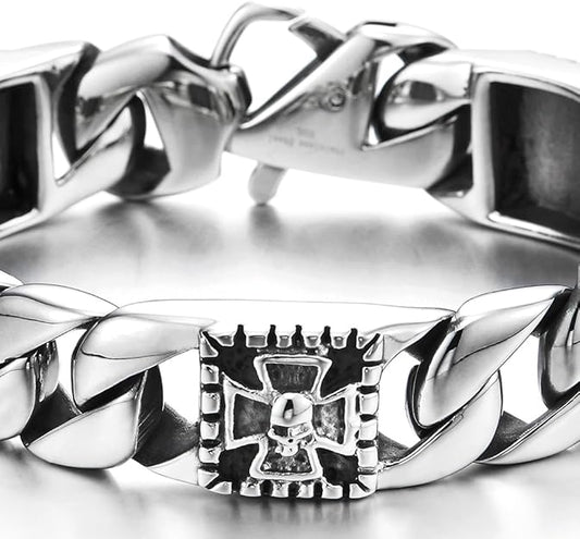 COOLSTEELANDBEYOND Mens Stainless Steel Curb Chain Bracelet with Cross and Skull, Biker Gothic, Vintage Polished