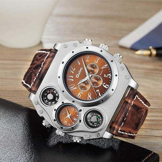 Avaner Mens Big Face Watch, Dual Time Zone Leather Strap Sport Watch, Analog Quartz Wrist Watch with Decorative Compass Thermometer Dial