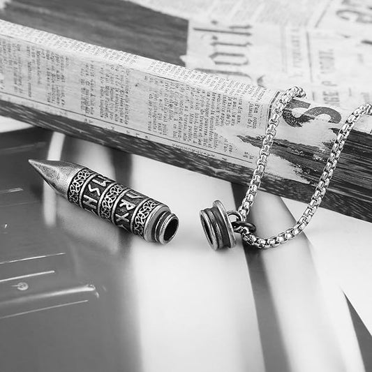 HZMAN Bullet Cremation Urn Necklace for Ashes Stainless Steel Viking Runes Memorial Pendant for Men Keepsake Jewelry