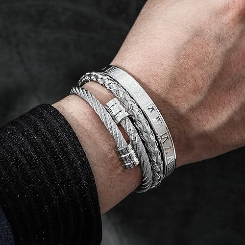 3PCS Stainless Steel Bracelets for Men Gold Roman Numeral Bangle Bracelet