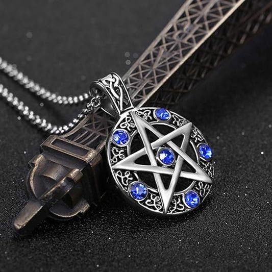 Leprato Stainless Steel Pentagram Pendant Necklace High Polished Blue Crystal Pentacle Charm Amulet Pendant Necklace for Men