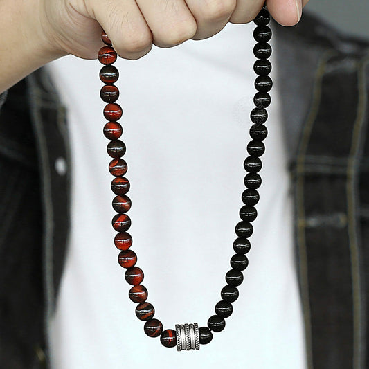 8mm Mixed Red Tiger Eye Black Glass Bead Necklace Stainless Steel Toggle Choker