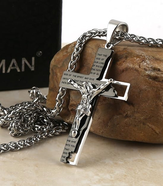 HZMAN Men's Stainless Steel Cross Crucifix Bible Prayer Pendant Necklace 22+2" Chain