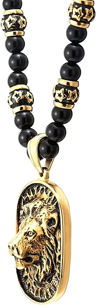 COOLSTEELANDBEYOND Gothic Style Men's Beads Necklace with Stainless Steel Lion Head Shield Pendant