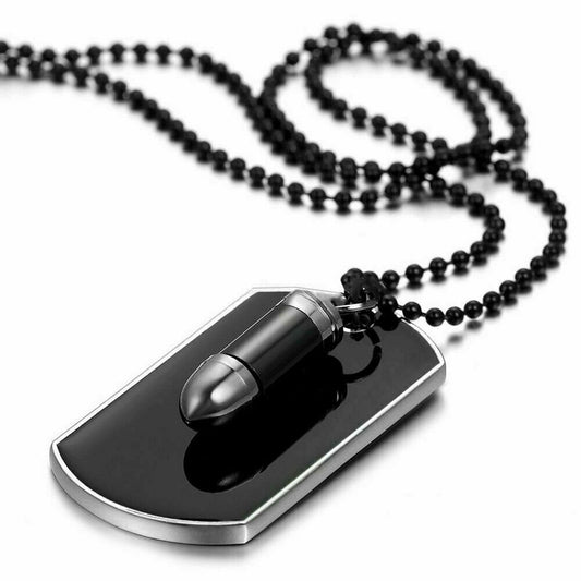 Men's Stainless Steel Black Bullet Dog Tag Pendant Necklace w Bead Chain