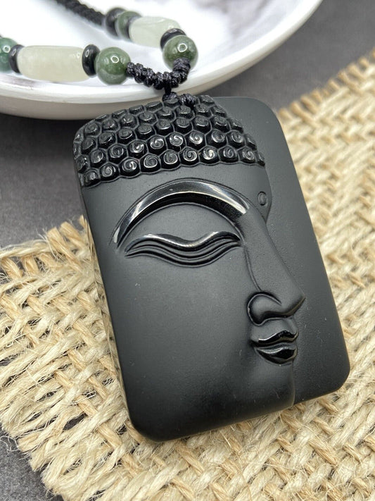 Jade Obsidian Buddha Charm Pendant Necklace Beads Cord Handmade Carved Gemstone