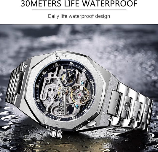 FORSINING Automatic Watch Mechanical Wrist Watch for Men Octagonal Waterproof Skeleton Watches Luxury Diamond Tourbillon Silver Stainless Steel Band
