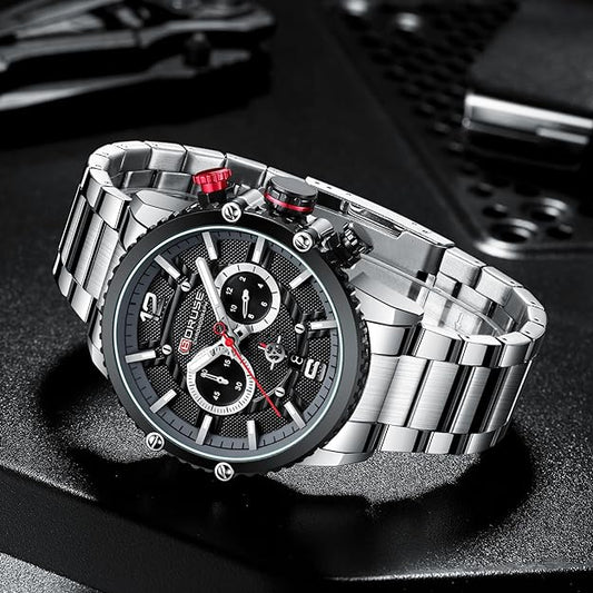 Mens Watches Luxury Silver Stainless Steel Chronograph Watch Fashion Business Big Face Waterproof Luminous Calendar Analog Quartz Wristwatch