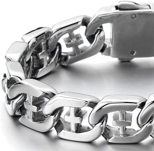 COOLSTEELANDBEYOND Men's Stainless Steel Curb Chain Bracelet with Cross Silver Color High Polished