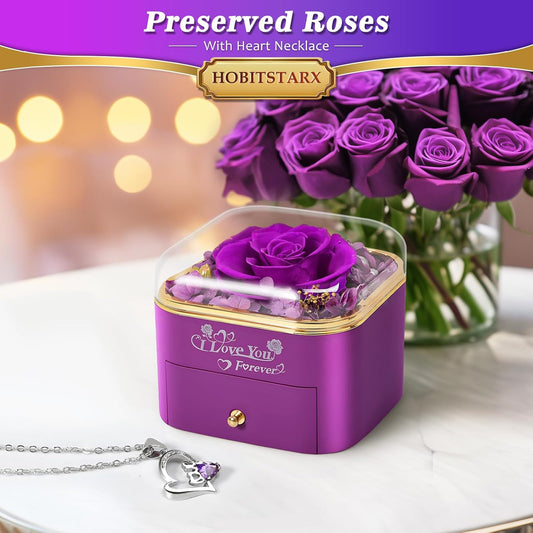 Preserved Real Purple/Red Rose with Love Necklace,Forever Flowers Gifts for Women Wife Mom Grandma Girlfriend, Christmas Valentines Anniversary Birthday Gifts for Her