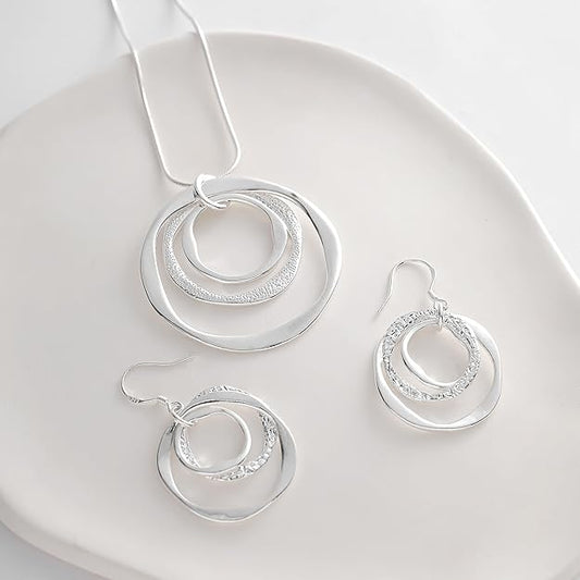 3 Circles Silver Hoop Earrings and Necklace Set for Women - 925 Plated Hypoallergenic Small Hoops