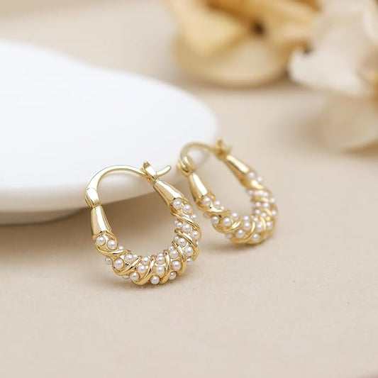 Jean Beau Gold Pearl Hoop Earrings for Women, Trendy 14k Gold Plated Statement Hypoallergenic Earrings Fashion Jewelry Gift