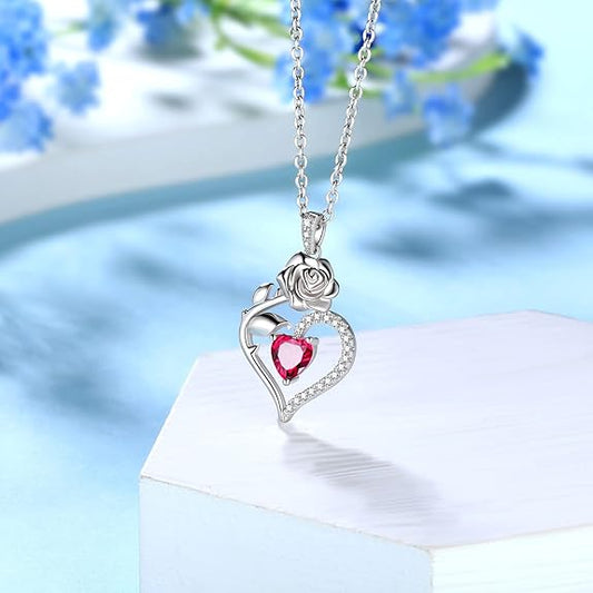 Jewmon Heart Rose Birthstone Necklace for Women 925 Sterling Silver Rose Flower Heart Birthstone Pendant Necklace Rose Necklace Birthstone Jewelry for Birthday Draduation Christmas Gift for Women Girl
