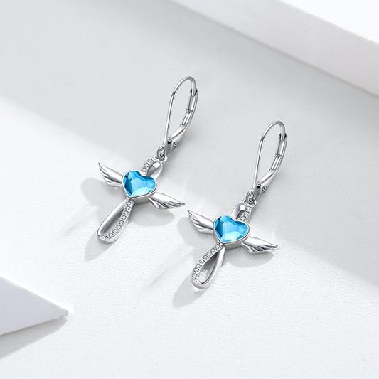 Midir&Etain Lever Earrings 925 Sterling Silver Birthstone Angel Wings Cross Earrings Crystal Jewelry Birthday Gifts for Women
