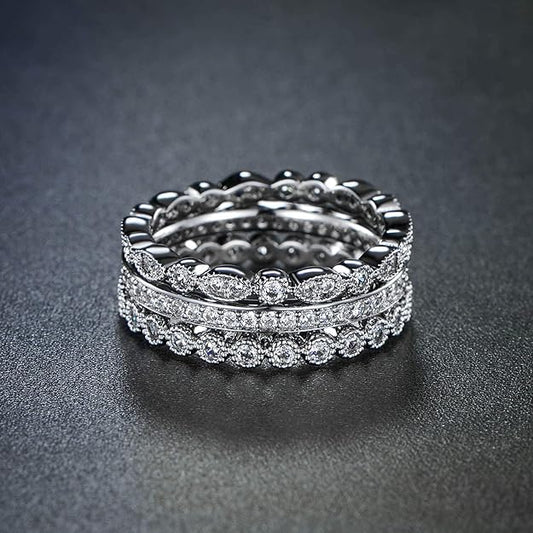 OPOMOMO 3 Pcs 2mm Women Stackable Eternity Ring Wedding Bands,18K White Gold Plated Cubic Zirconia Rings Pack Size 8