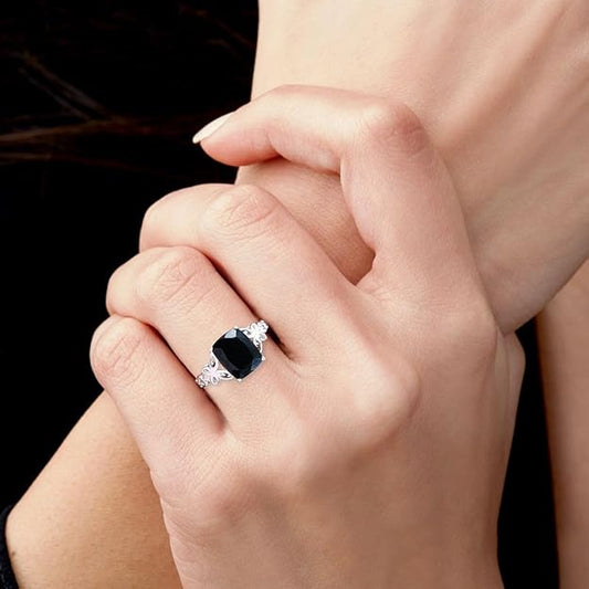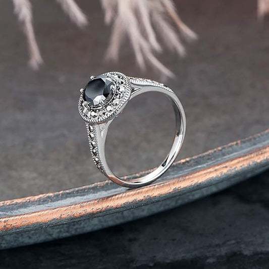Black Tourmaline Ring in 925 Sterling Silver - October Birthstone Rings for Women - Engagement Promise Floral Statement Vintage Solitaire Tourmaline Jewelry Size 6