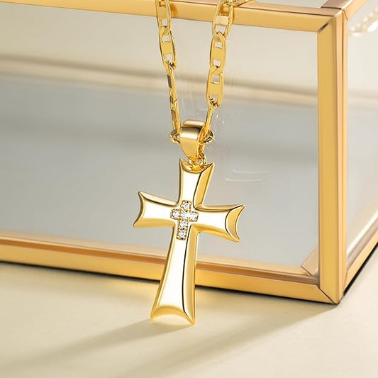 Cross Necklace for Women Gold Cross Necklaces for Women Cubic Zirconia 14K Gold Crosses Chain Necklace Pendant for Womens Mariner Chain Ribbon-Edge 48cm Womens Crosses Necklaces 24mm
