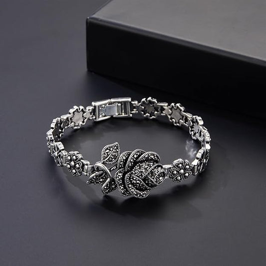 Vintage Charm Bracelet for Women Elegant Black Onyx and Marcasite with Silver Rose Flower Design, Retro Ideal for Women's Jewelry Gifts