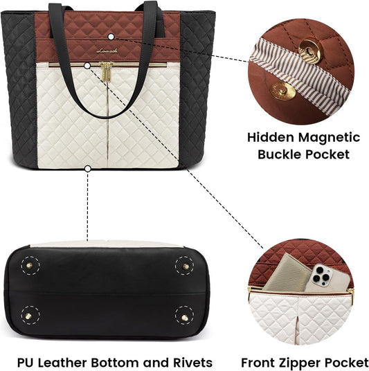 LOVEVOOK Laptop Bag for Women 15.6 inch,Diamond Quilted Work Tote Bags Womens Laptop Computer Shoulder Bags,Stylish Travel Tote Bags Laptop Purse Briefcase Handbag with Clutch Purse,Brown-Black-White