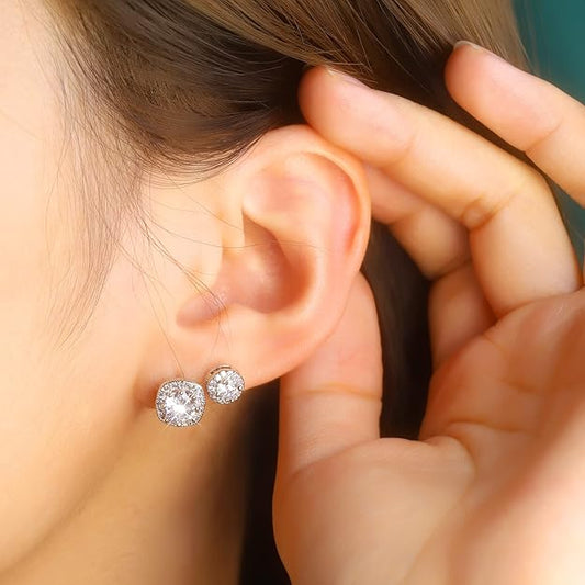 ALEXCRAFT Sterling Silver Stud Earrings for Women Girls Cubic Zirconia Halo Round Heart Square Diamond Large Silver Stud Set