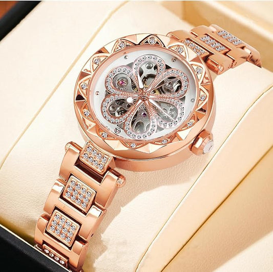 FORSINING Women Automatic Mechanical Watches Skeleton Steampunk Watch with Diamond and Carving Flower Craft Cold Watch for Women Minimalist Retro Design Mechanical Skeleton Wrist Watch Transparent