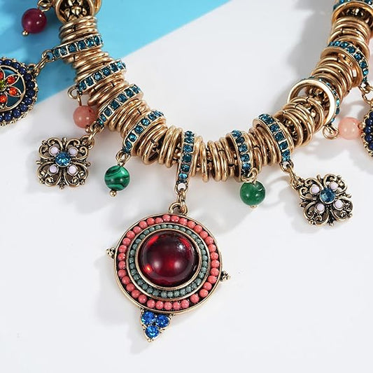 SUNLAND Bohemian Multicolor Round Pendants Enamel Rhinestone Ethnic Necklace for Women