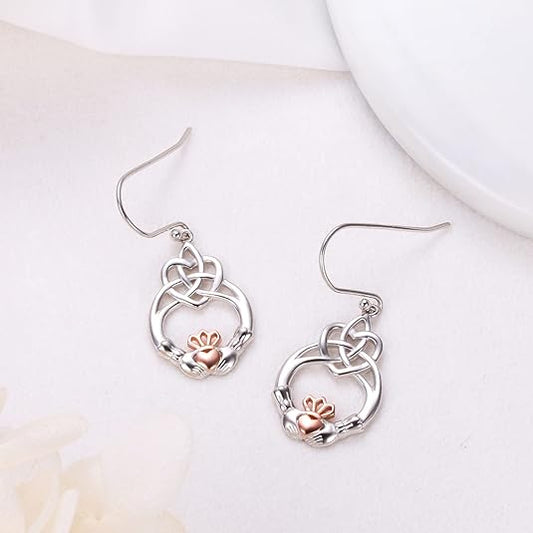 925 Sterling Silver Dangle Earrings for Women Celtic Knot Drop Claddagh/Clover/Lotus/Filigree Earrings Rose Gold Claddagh Hoop Earrings Friendship Jewelry Gift for Women