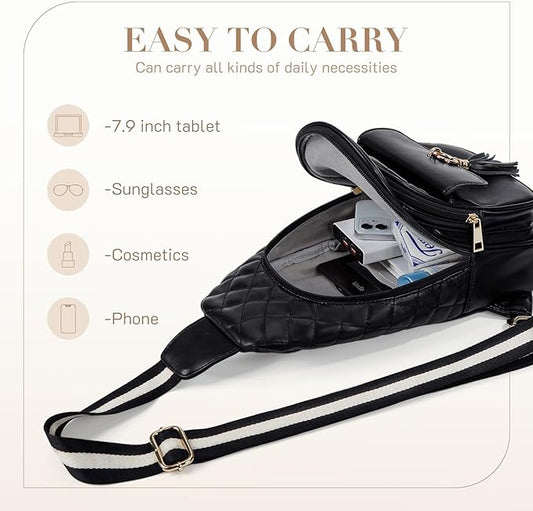 Missnine Sling Bag for Women Quilted PU Leather Fanny Pack Crossbody Bags Trendy Chest Bag Hiking Cycling Travel with Tassel