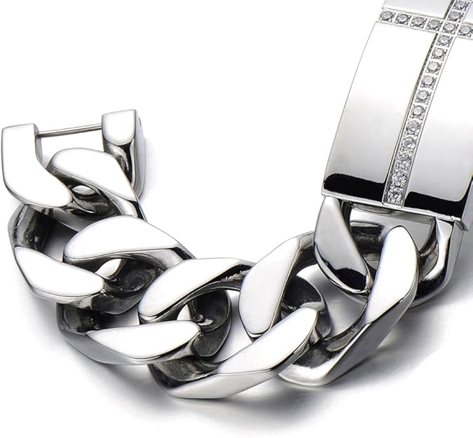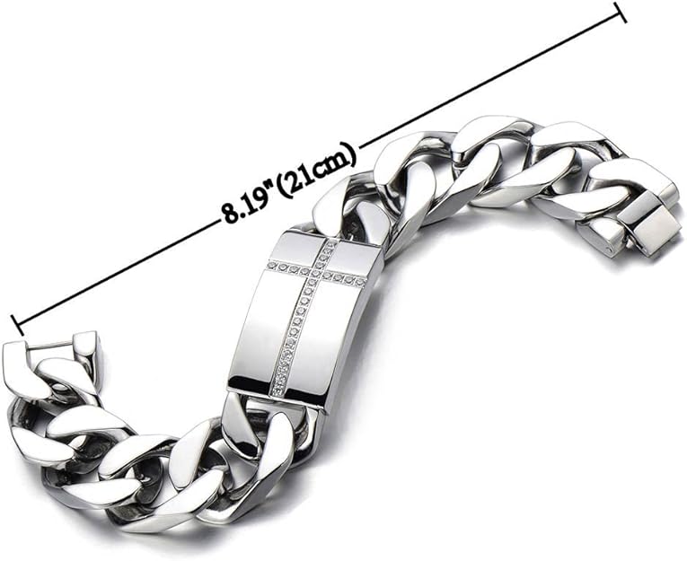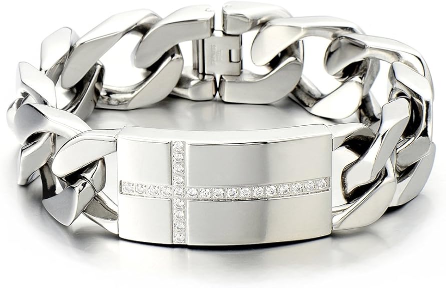 - Mens Large Stainless Steel Cross Identity Curb Chain Bracelet Set with Cubic Zirconia Hip Hop Rock