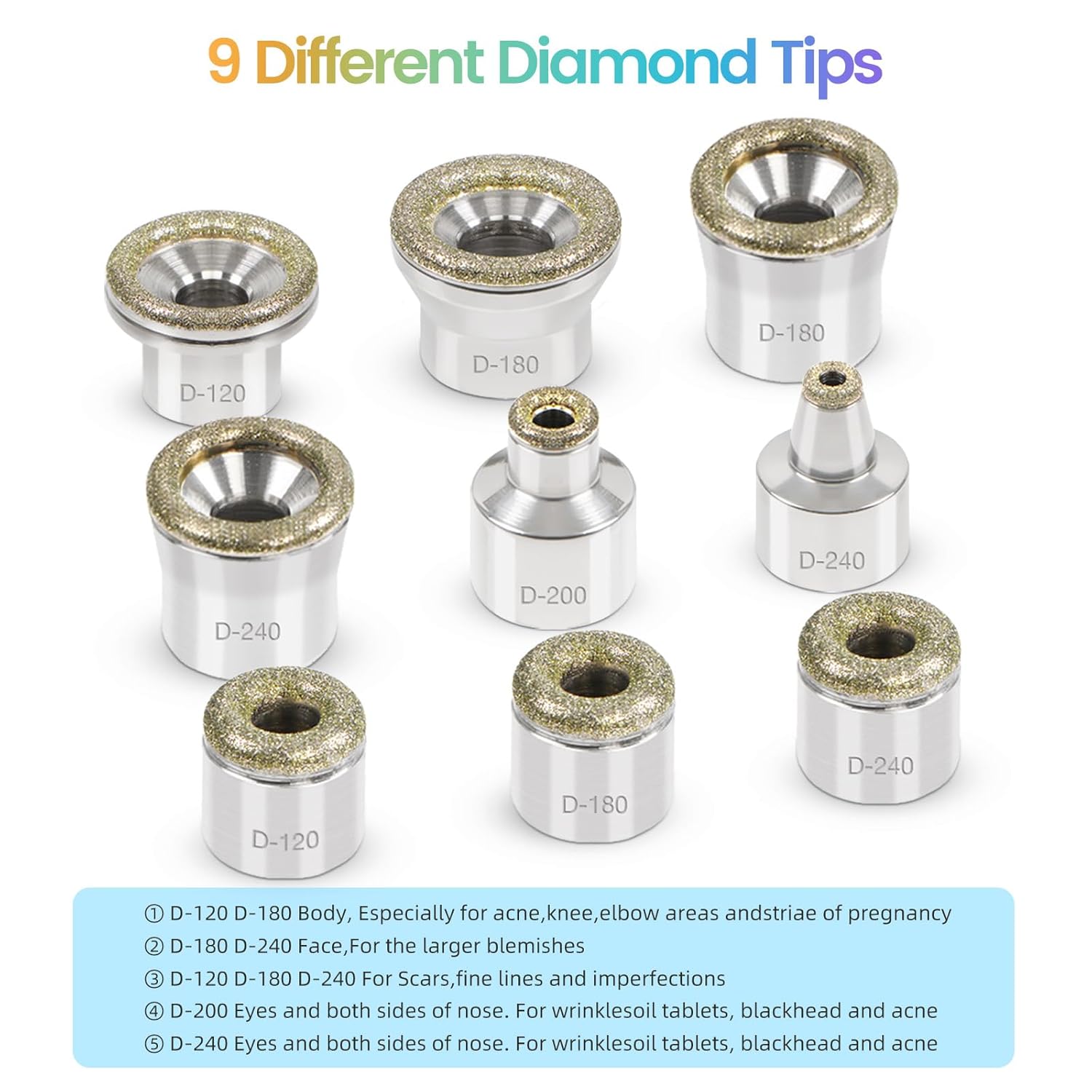 - 【Replaceable Diamond Head】The machine includes 3 diamond wands and 9 diamond tips for versatile use, allowing you to choose the right one for your specific skin needs