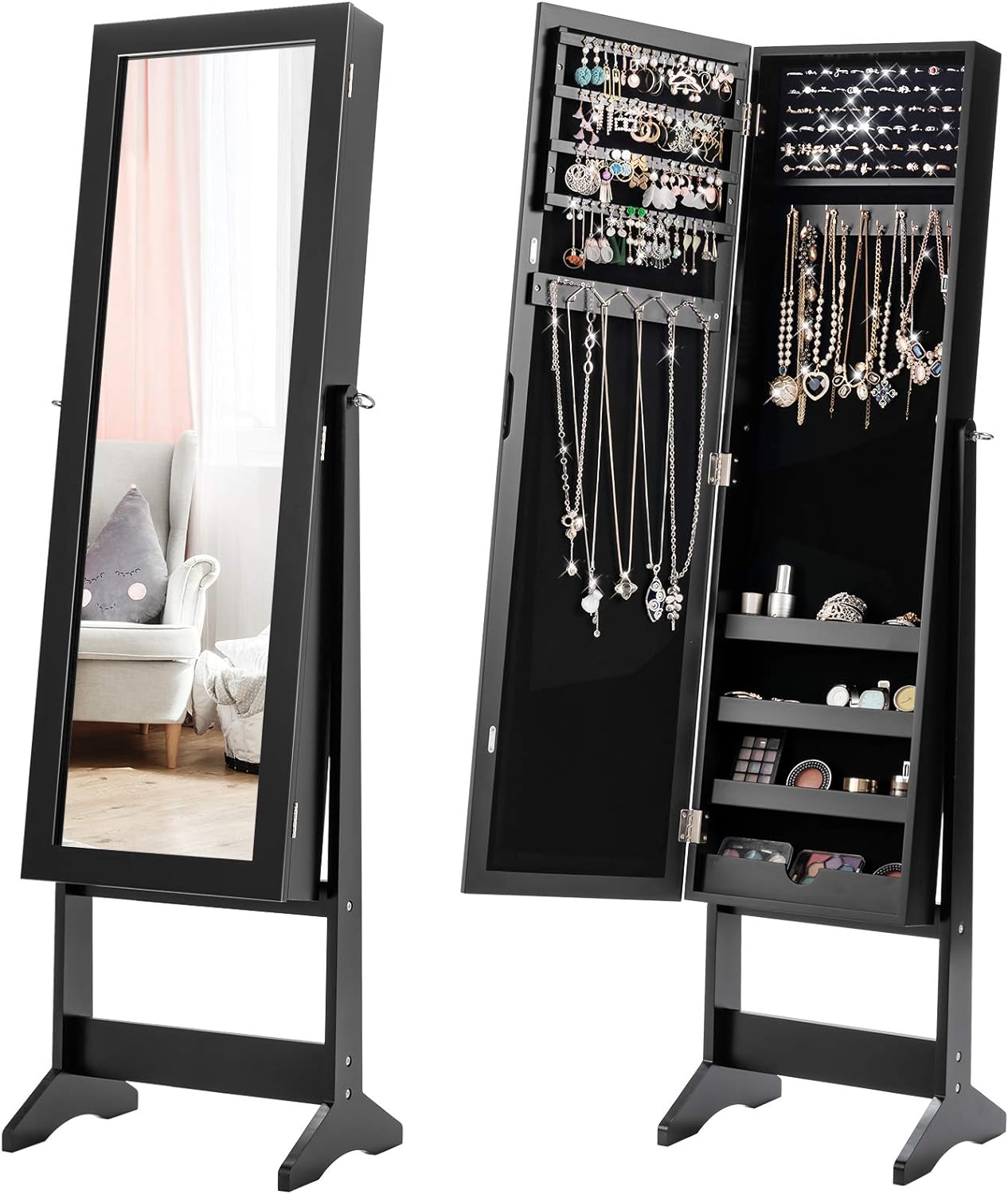 Giantex Jewelry Cabinet with Full-Length Mirror, Standing Jewelry Armoire Organizer with 64 Earring Slots, 72 Ring Slots, 20 Necklace Hooks, 4 Storage Shelves, 3 Angle Adjustable (Black)