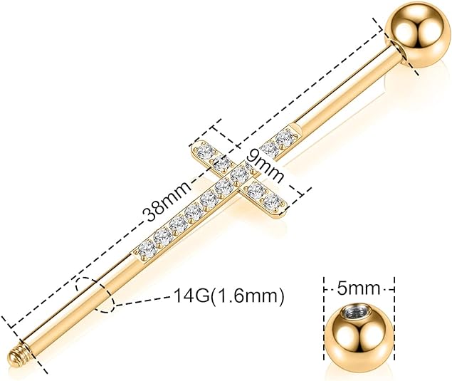- ➹Industrial Piercing Size&Color➹Color:Gold with clear CZ.Size:14 Gauge(1.6mm), Bar Length: 1 1/2" (38mm), Ball Size:5mm.Sold individually ,one industrial barbell per order.