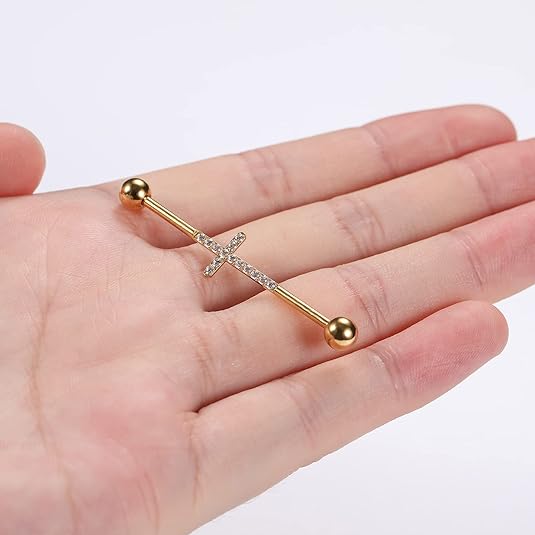 - ➹Attractive Style➹ Industrial barbell with cross and CZ in the middle to make it more shiny and charming on your ear cartilage. What's more, externally threaded design, easy to insert and take off,
