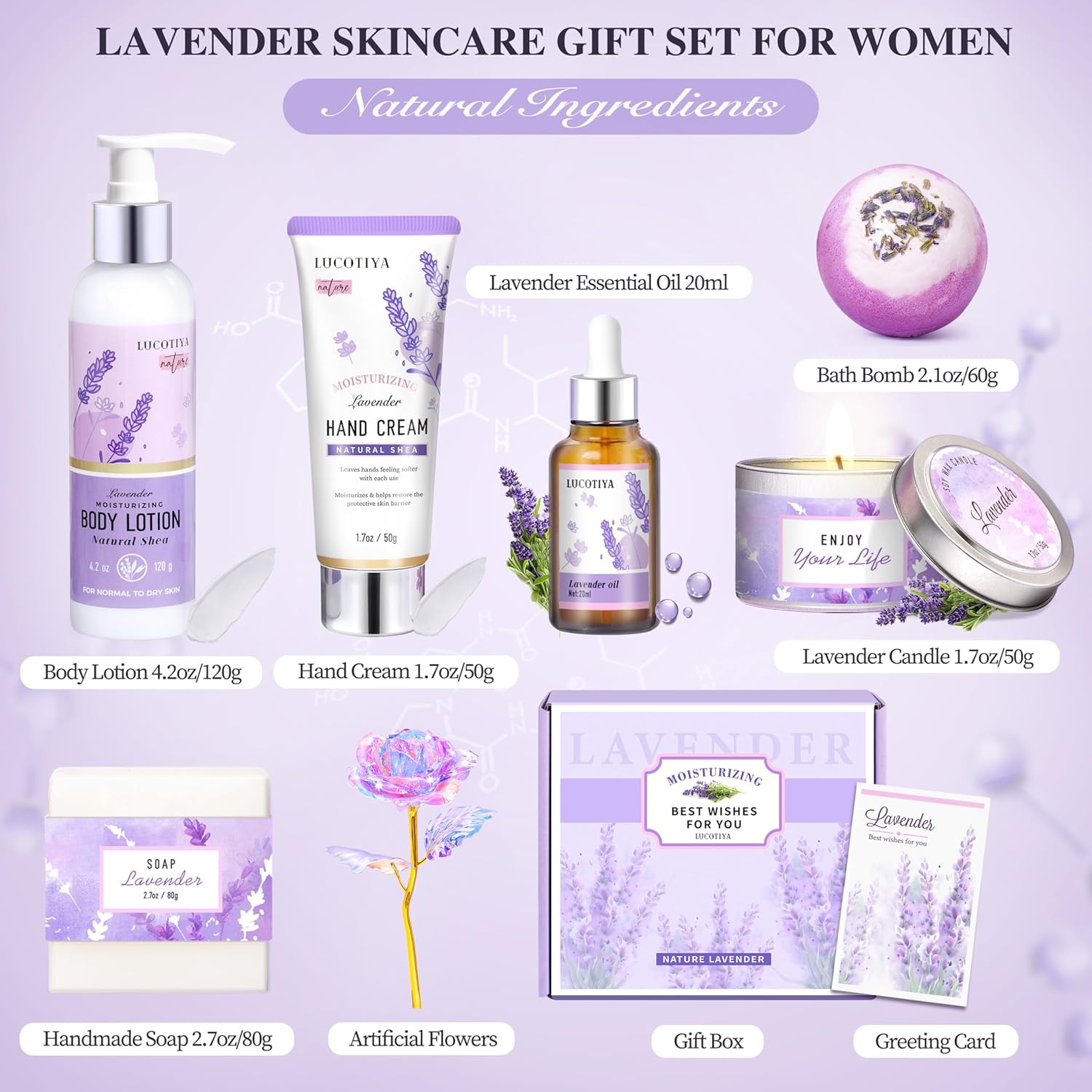 - NATURAL INGREDIENTS-Our lavender spa gifts for women is infused with avariety of plants extracts such as Chamomilla Recutita,shea butter and lavender oils to moisturize and soften dry skin,gently nourishes,suitable for all skin types.