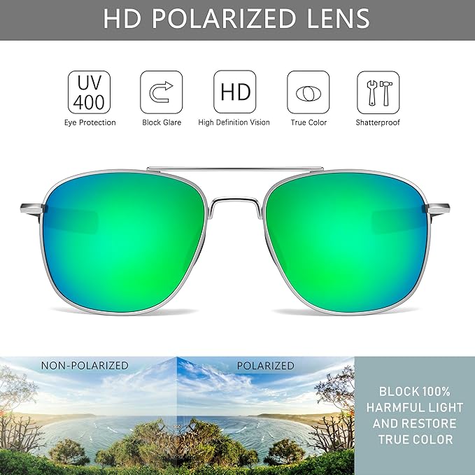 - Classic aviator style with trendy green lens: The classic square aviator style gets a modern twist with the silver frame green mirror lens; Plus, their unisex design makes them a popular option for teens and adults, suitable for a wide range of face sizes and shapes