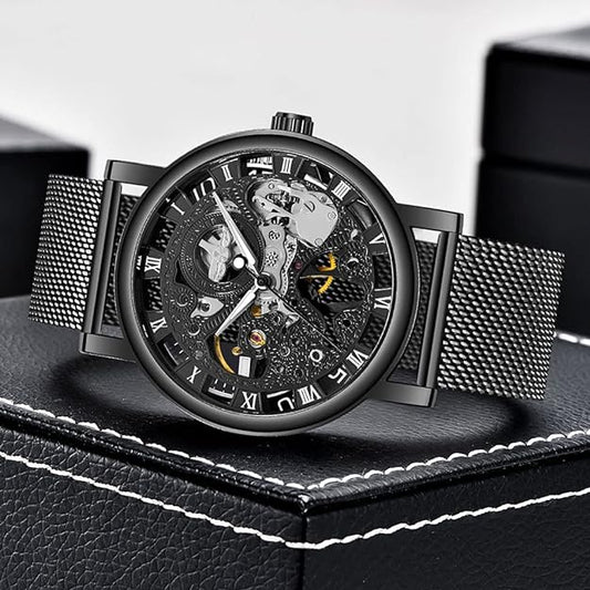 Men's Skeleton Mechanical Roman Numeral Mesh Strap Watch, Hand Winding Mechanical Mesh Luminous Waterproof Watch for Men
